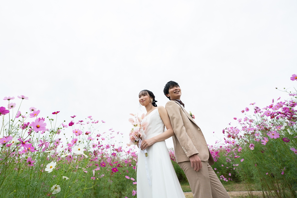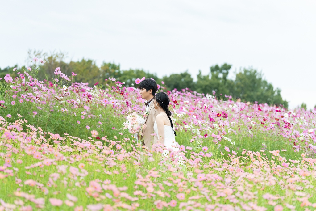 四季折々の花々と広大な芝生が広がる万博記念公園では、自然のスケール感を活かした開放的なウェディングフォトが叶います。季節の花畑や日本庭園でのしっとりとした撮影はもちろん、太陽の塔を背景にした印象的で唯一無二のカットも魅力。緑と光、そして大阪を象徴する景色を取り入れた、多彩なロケーション撮影をお楽しみいただけます。