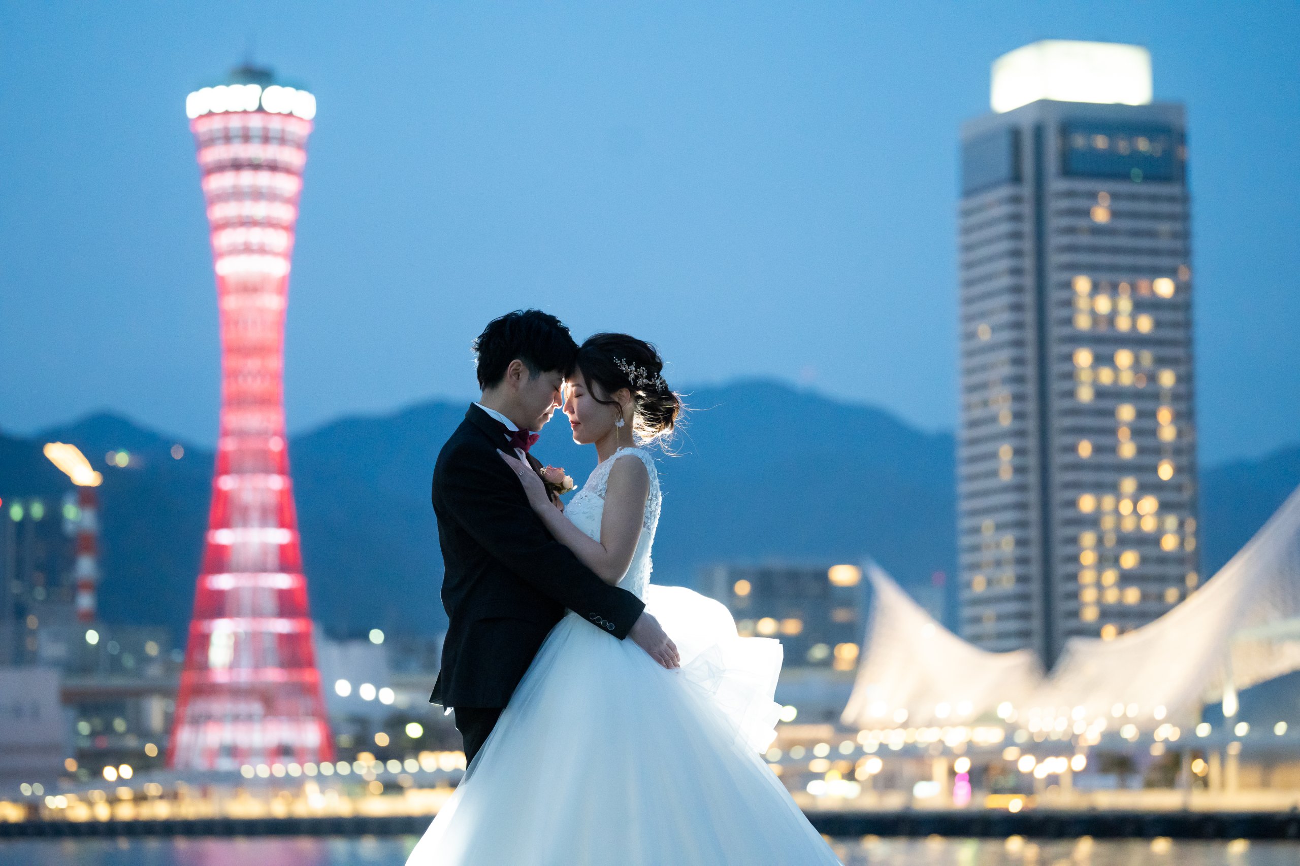 ポートタワーや観覧車のライトアップ、豪華客船から漏れ出す光を組み合わせると、ロマンチックな結婚写真に仕上がります。
