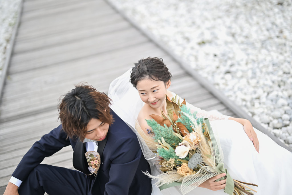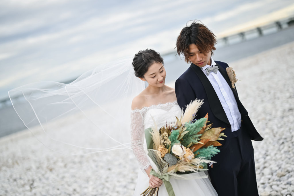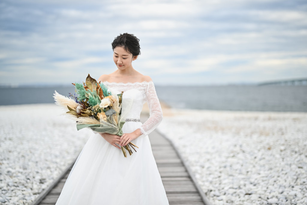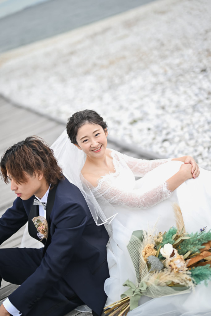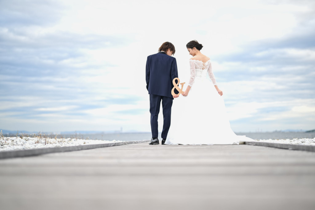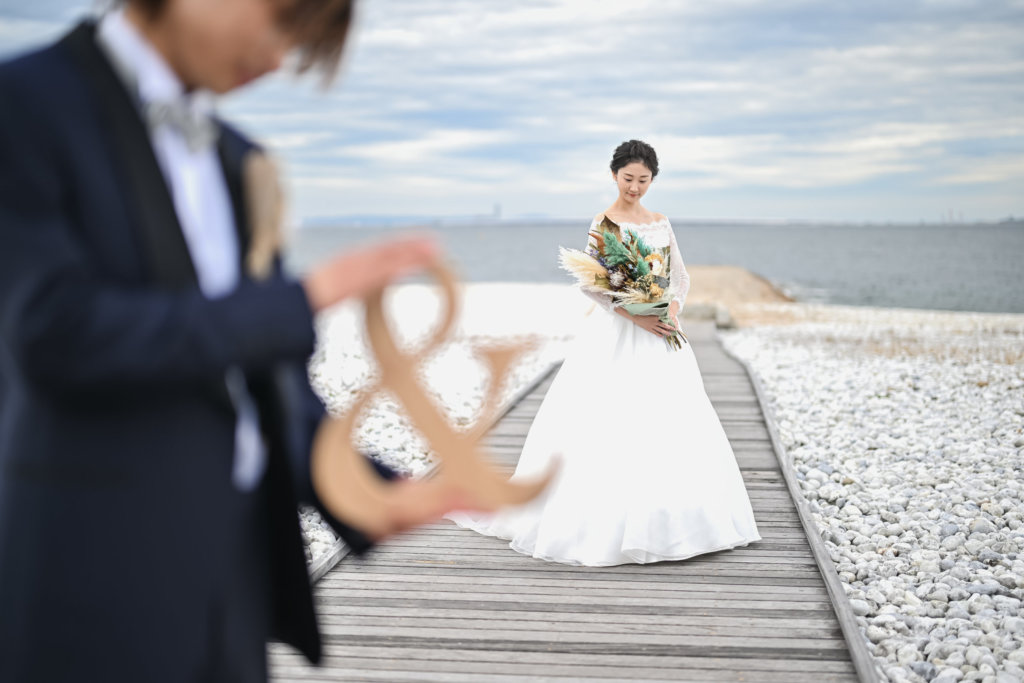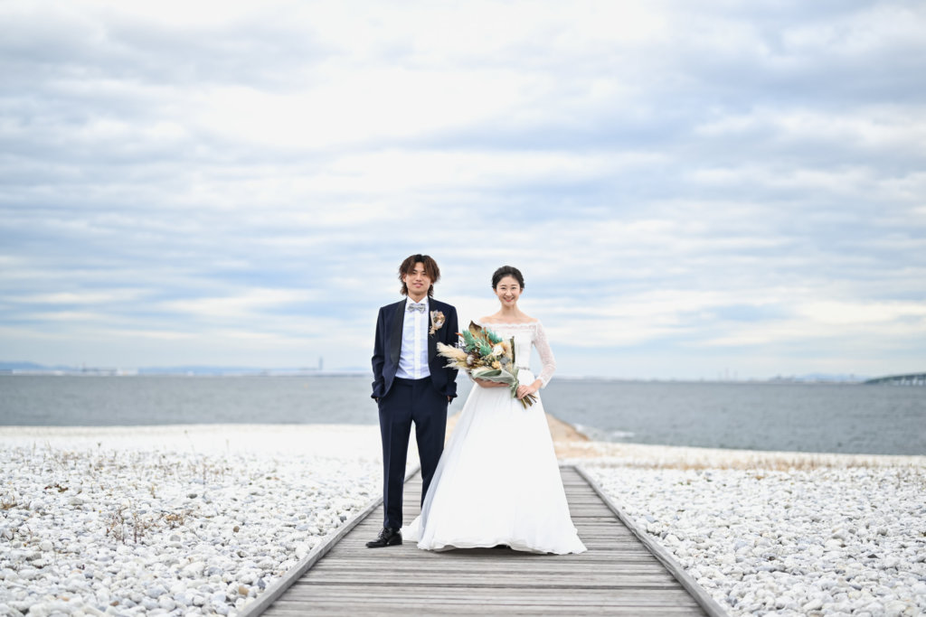 大阪では透明度の高い大阪湾の海辺で、まるでリゾートフォトウェディングのようなロマンチックなロケーションです。