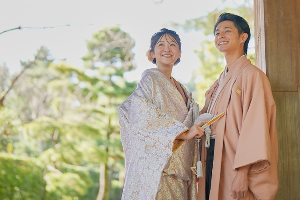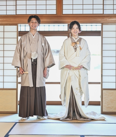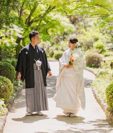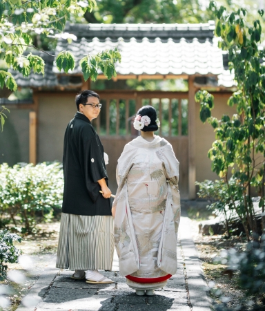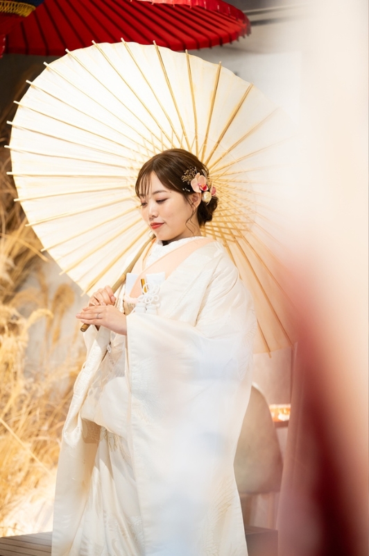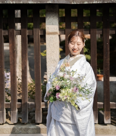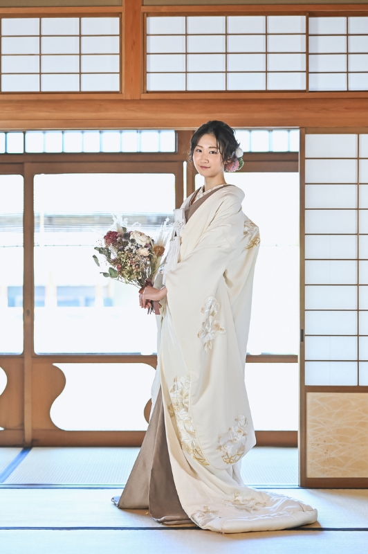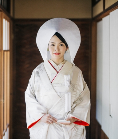 凛とした可愛らしさの溢れる白無垢。屋内でも屋外でも、その濁りのない透明感と美しさに浸る至福の一着です。