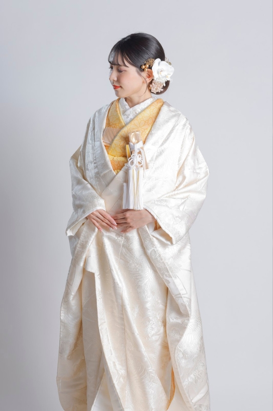 空高く舞い飛ぶ鶴が特徴的な白無垢。生彩に満ちた華やかなお着物は凛とした姿を心豊かに表現します。