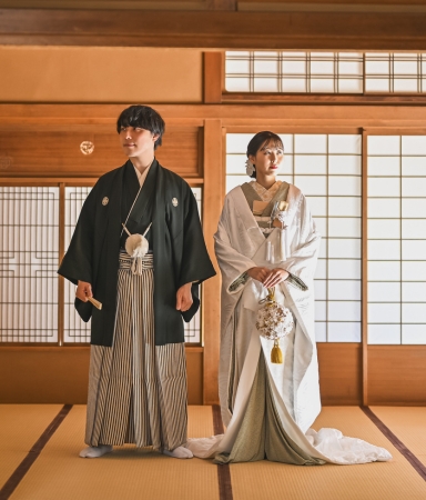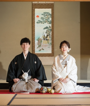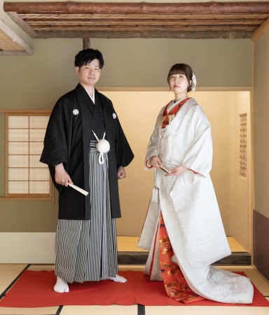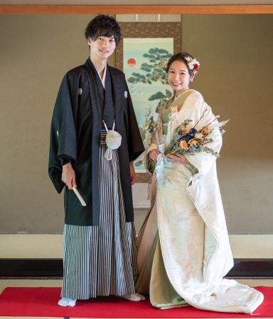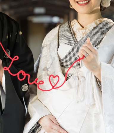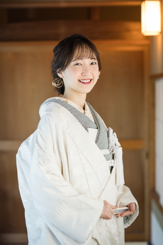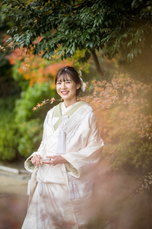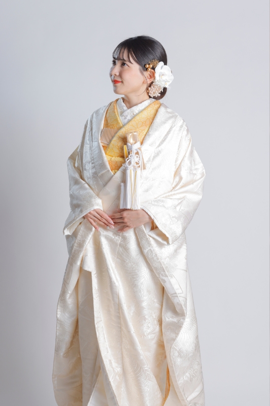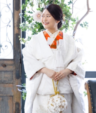 特徴:色掛下の中で唯一柄の入った一着。色打掛でも人気の赤のお着物を白無垢の中に着ることで伝統的な印象も感じるコーディネートに。色打掛の色味も美しいツヤ感がある発色の良いカラーで、明るさと豪華さを引き立たせてくれます。