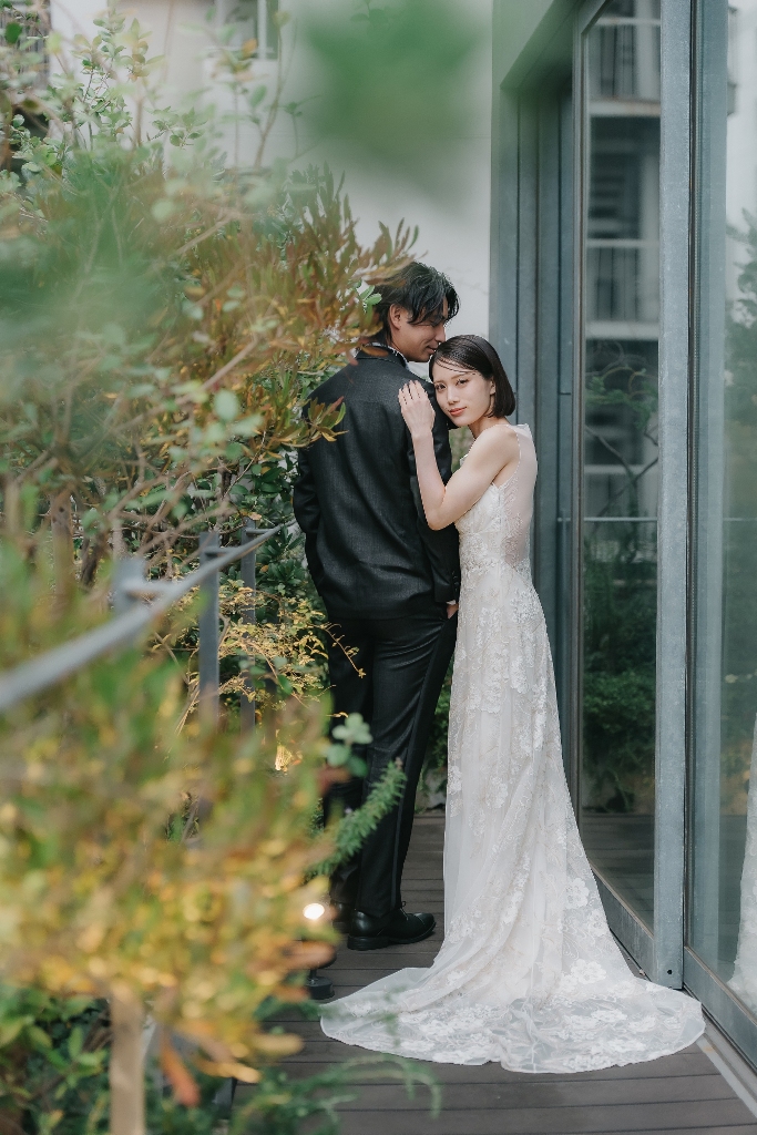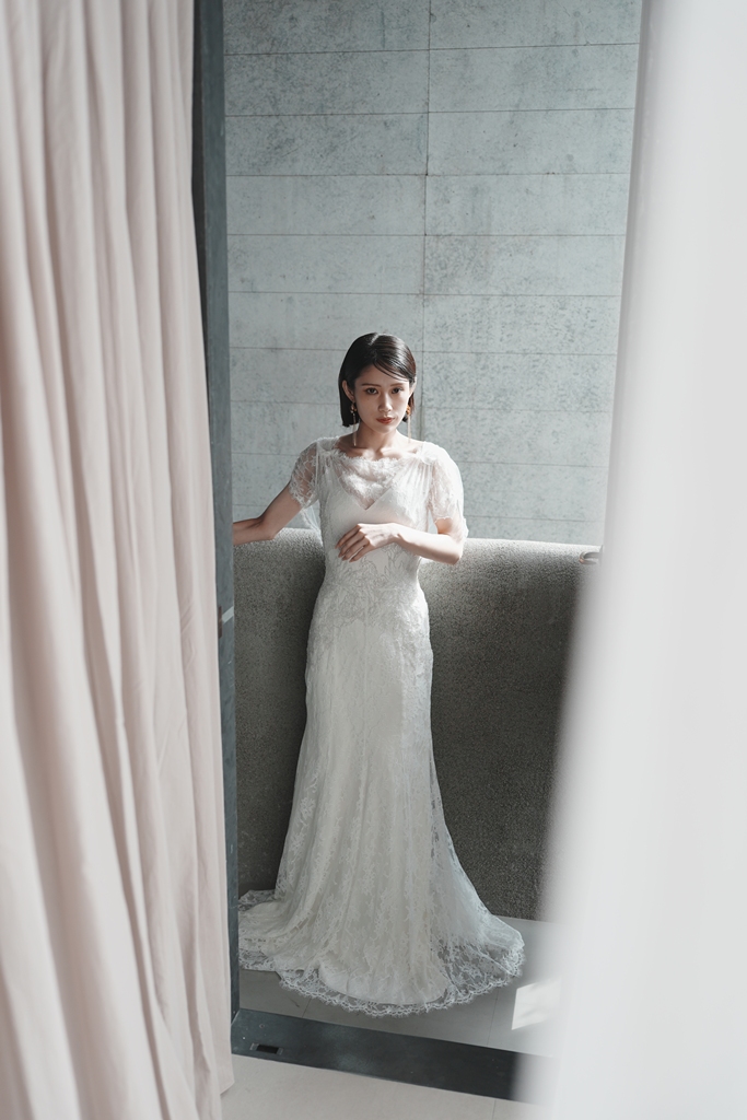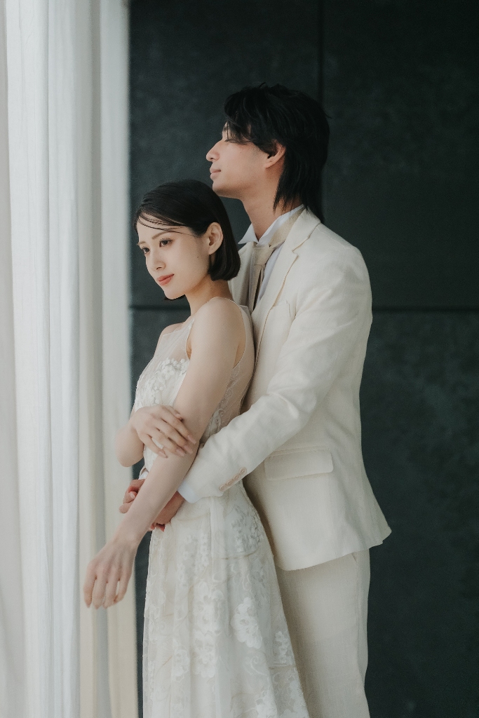 リネンカーテン越しに差し込むnatural lightは、表情や仕草をやさしく包み込み、ナチュラルで品のあるドレスフォトを演出。