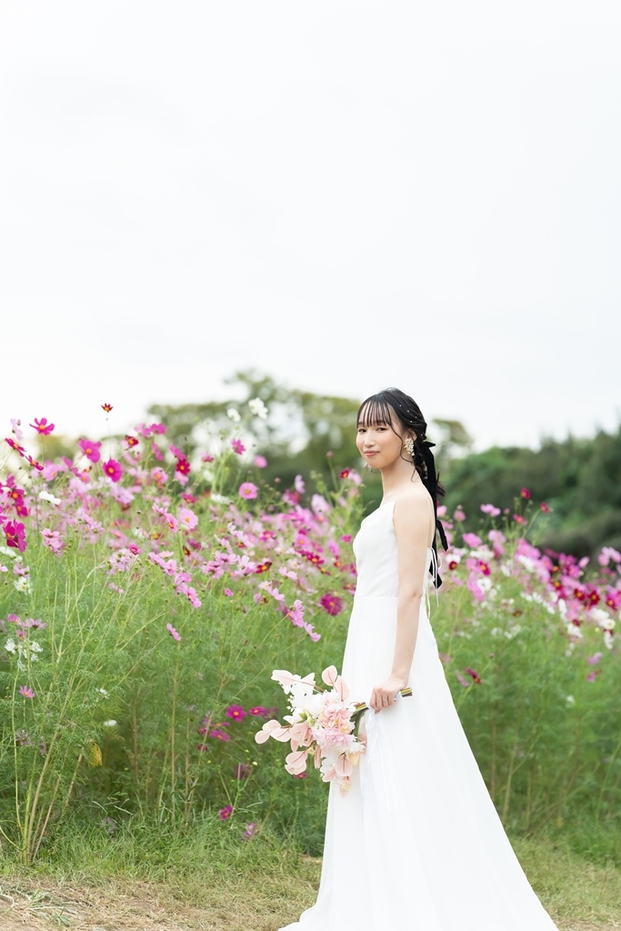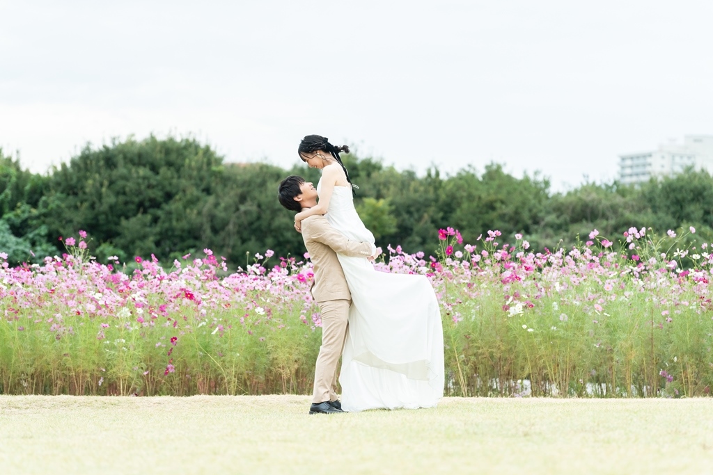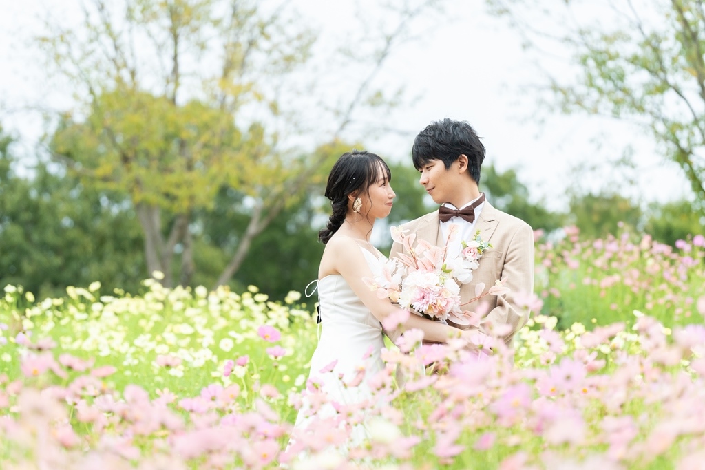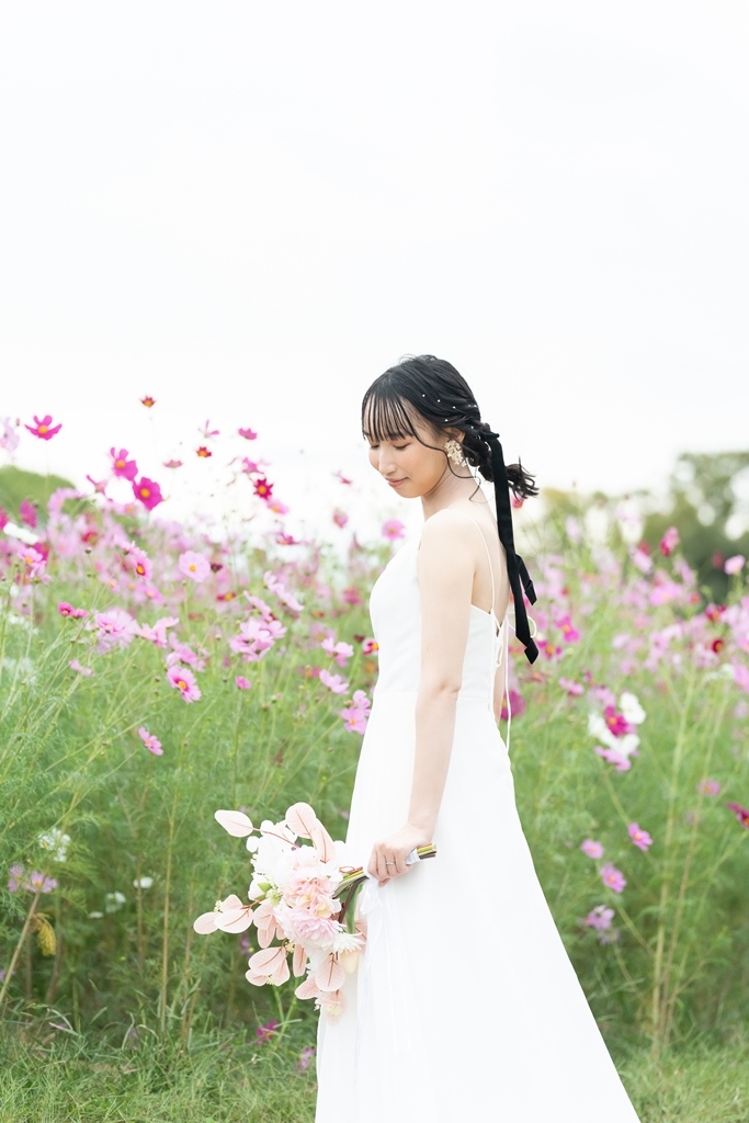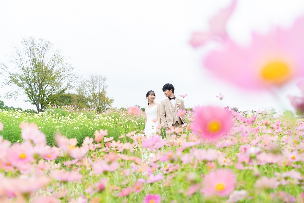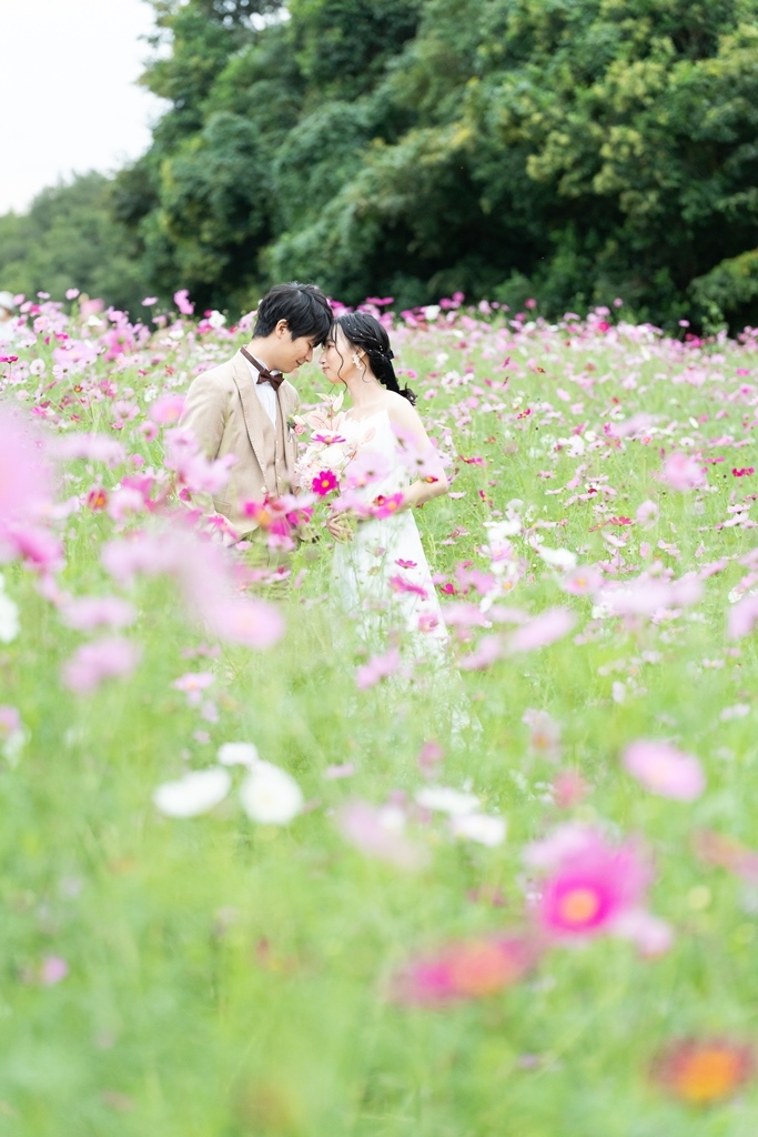 色鮮やかな秋桜に真っ白なウェディングドレスが映えていて、とてもお似合いです✨どれも素敵なお写真で、お二人の良い想い出になっていたら嬉しいです!