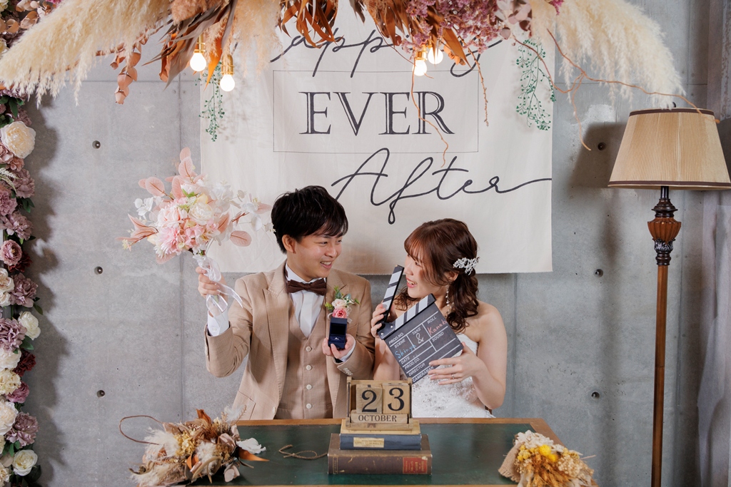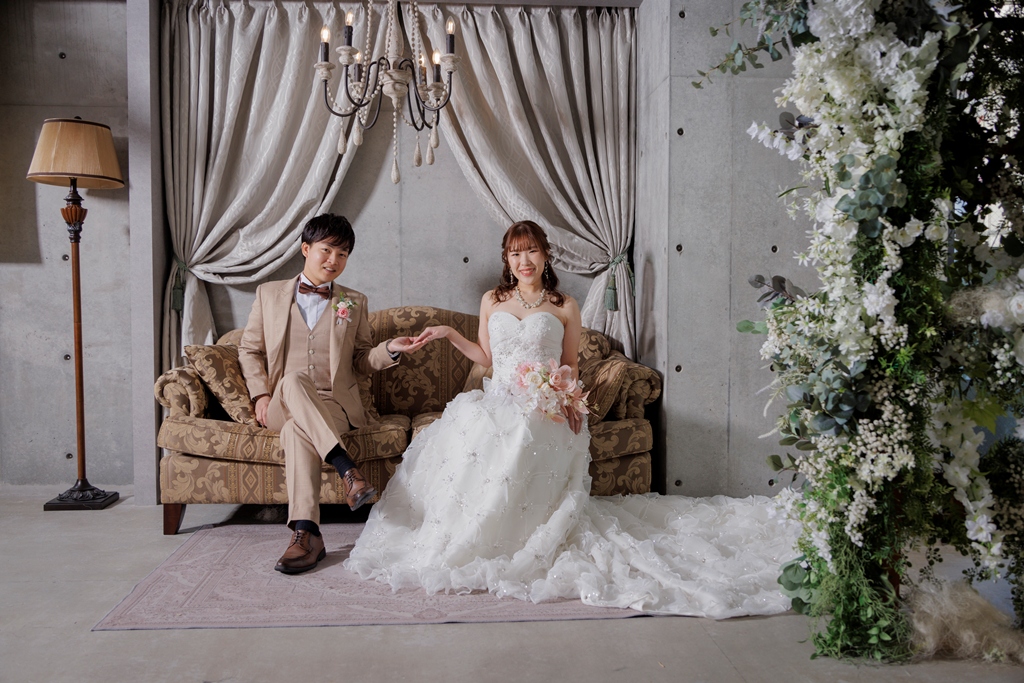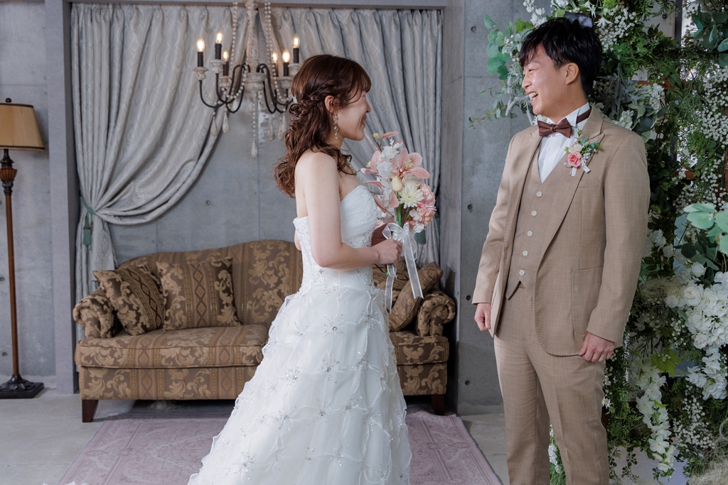 理由などを教えてください - リーズナブルにスタジオでの洋装撮影ができるスタジオを探していた時に見つけました。口コミの評価も良く、背景もたくさん選べたのが決め手です。あと、大阪市内で自宅から近く、またお互いの家族も来やすいところもプラス要素でした。
