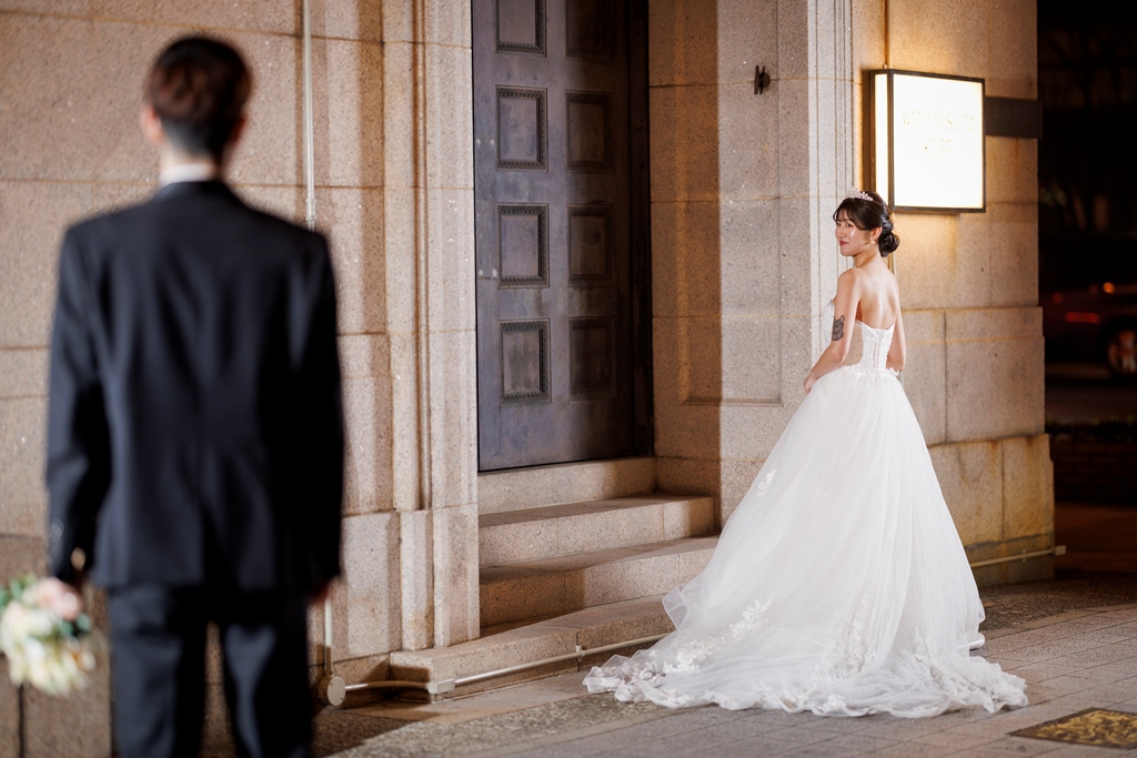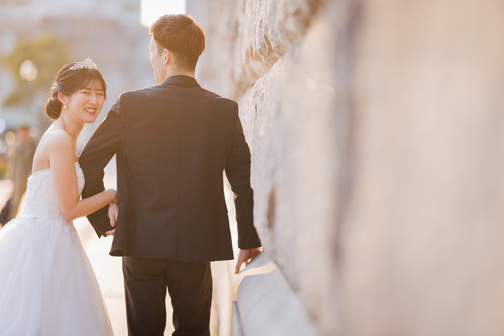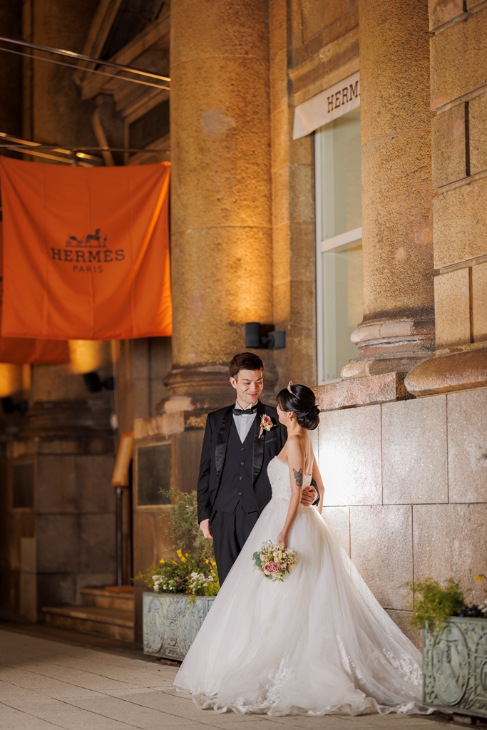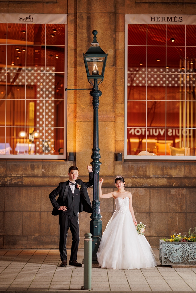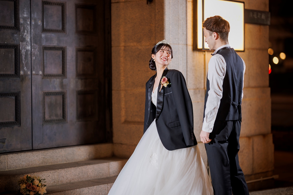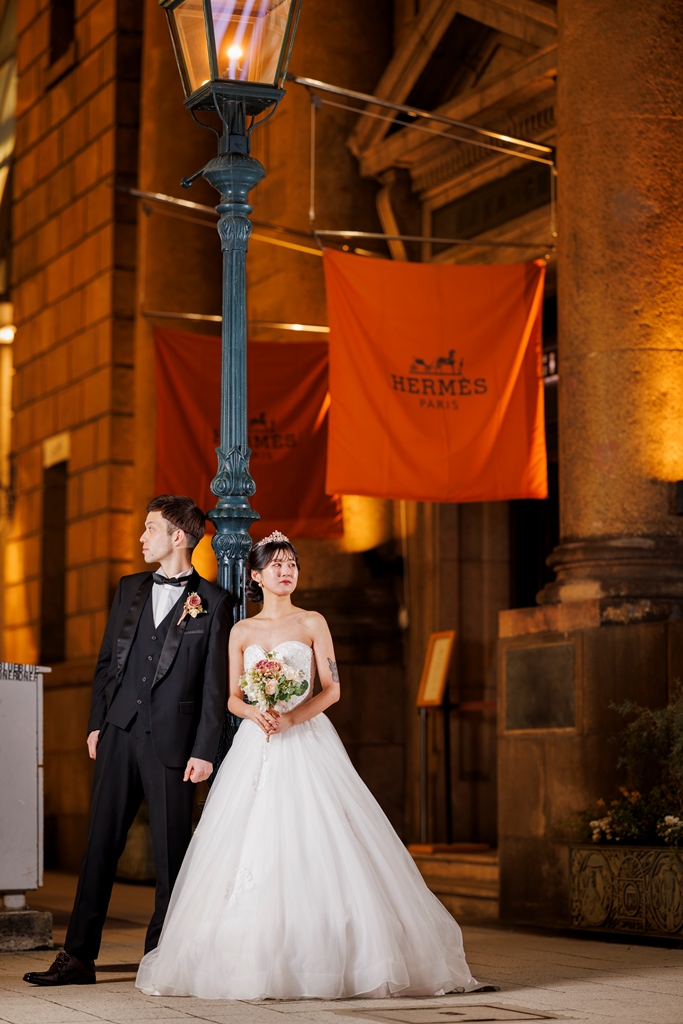 クラシカルな街並みと洋装が織りなす風景は、まるで映画のワンシーンのように美しく、おふたりの雰囲気にぴったりでした。雨上がりの石畳、やさしく差し込む光、微笑みあうおふたりの表情——どの瞬間も私たちにとって忘れられないものとなりました。
