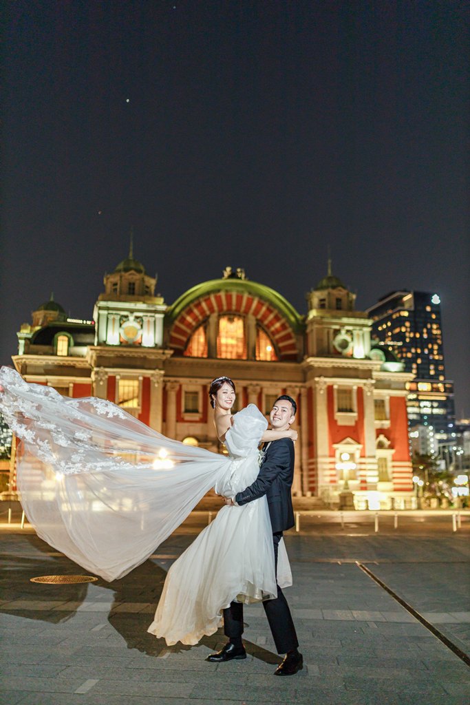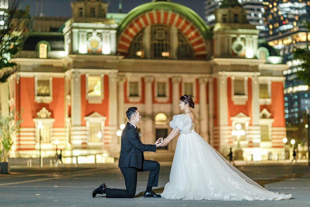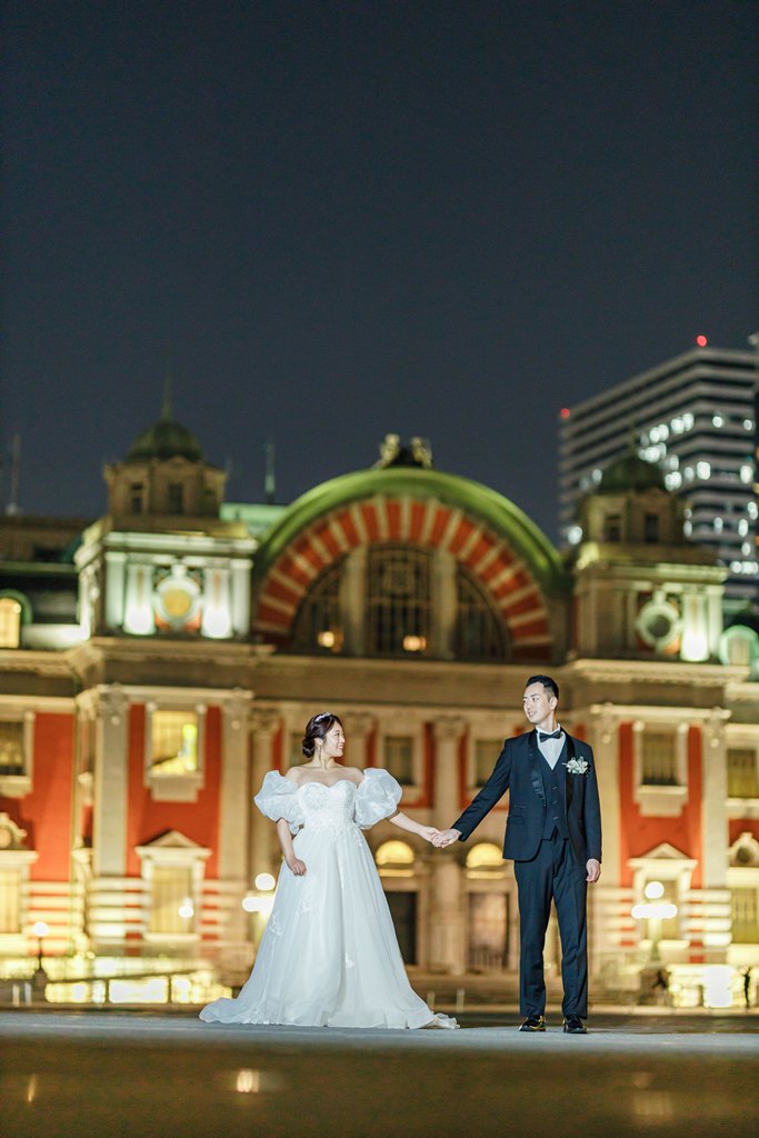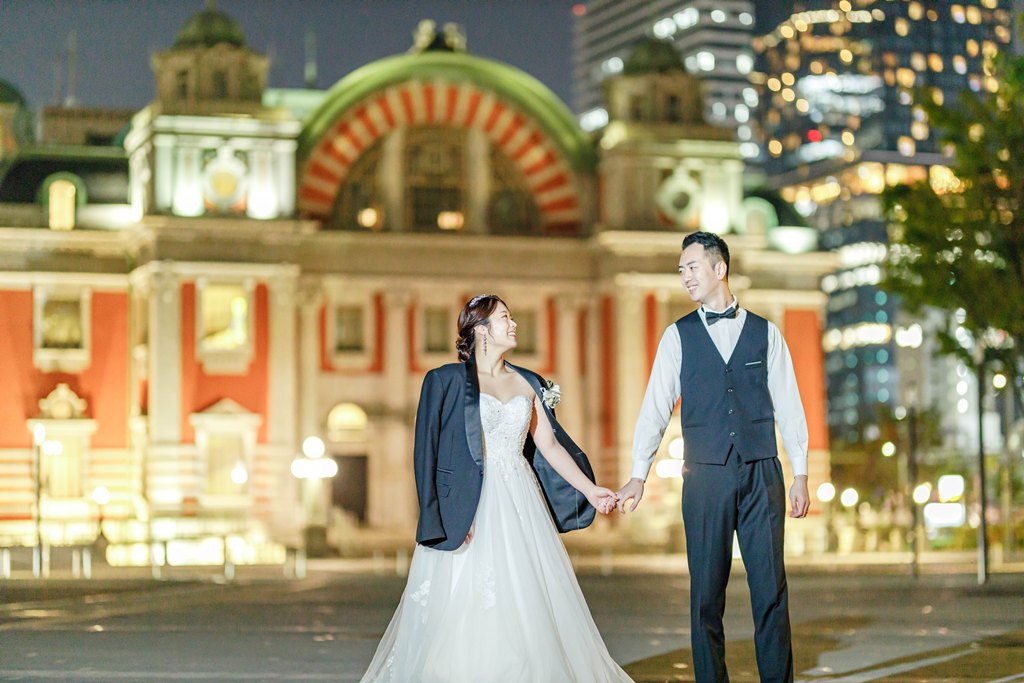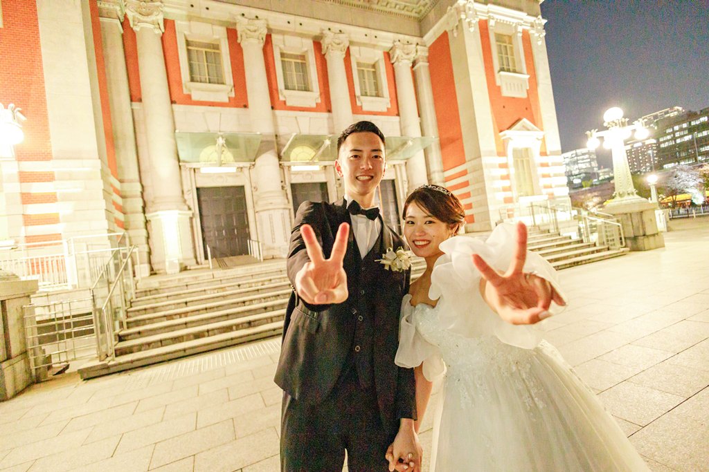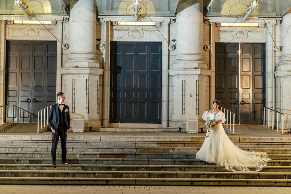 歴史と風格が漂う中央公会堂のライトアップと、ドレス&タキシード姿のおふたりの美しさが見事に重なり合い、まるで映画のワンシーンのような、幻想的でロマンチックな時間となりました。