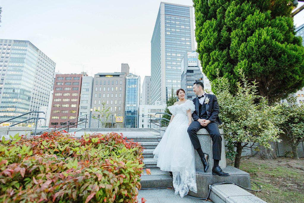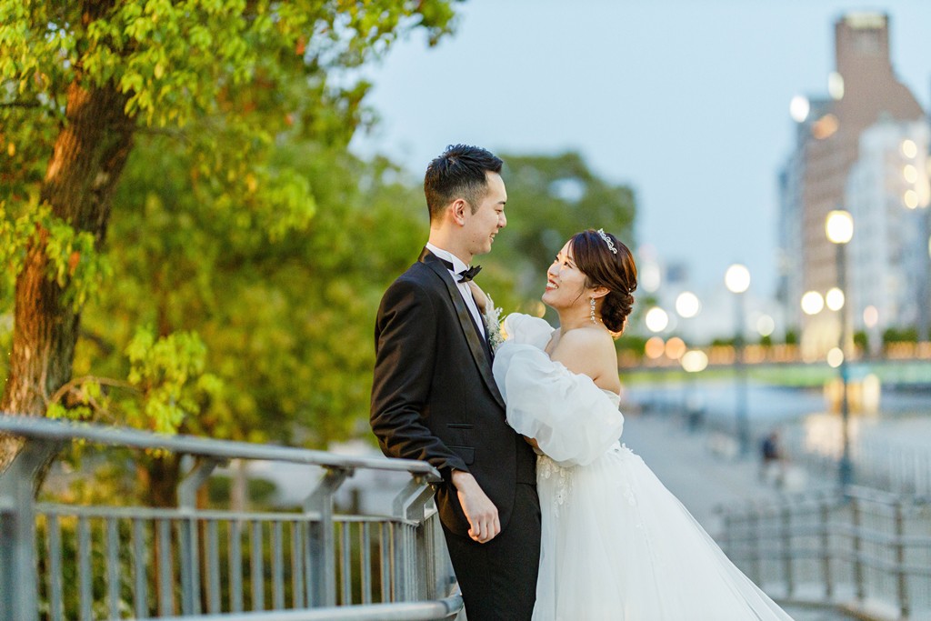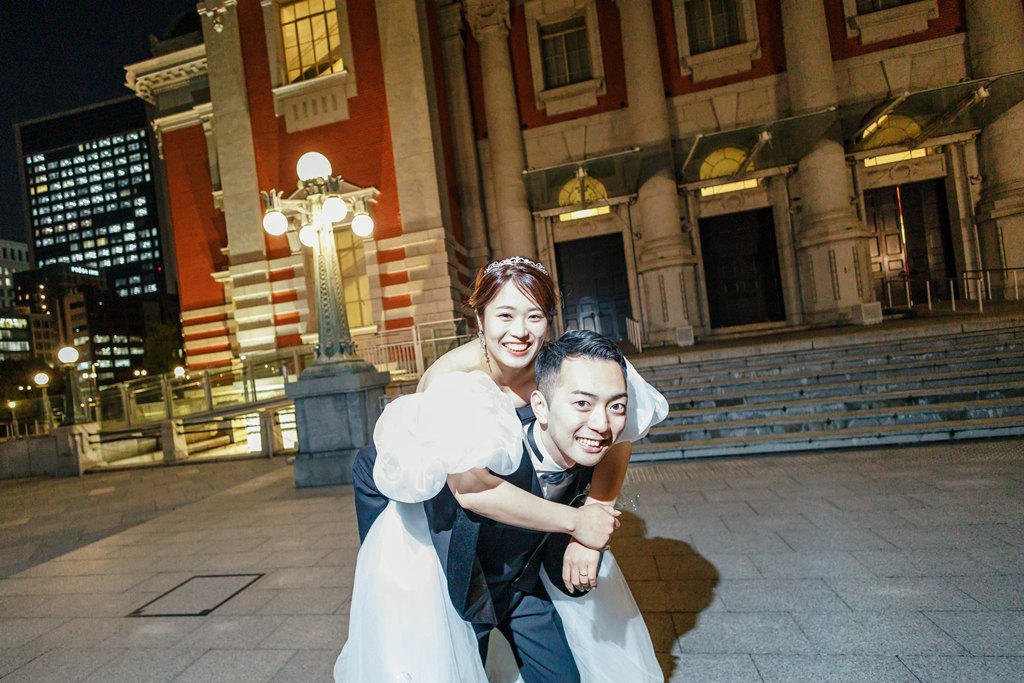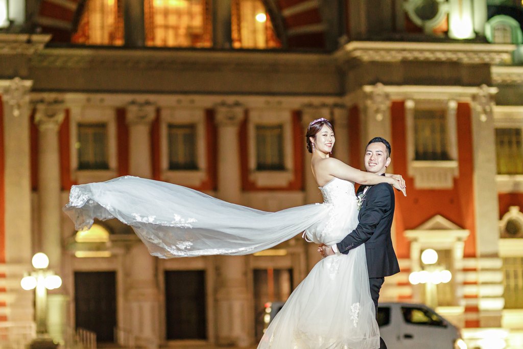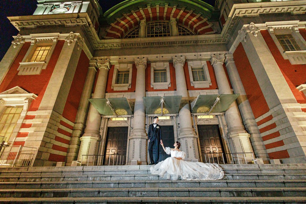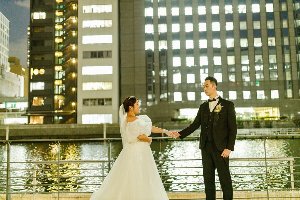 歴史と風格が漂う中央公会堂のライトアップと、ドレス&タキシード姿のおふたりの美しさが見事に重なり合い、まるで映画のワンシーンのような、幻想的でロマンチックな時間となりました。