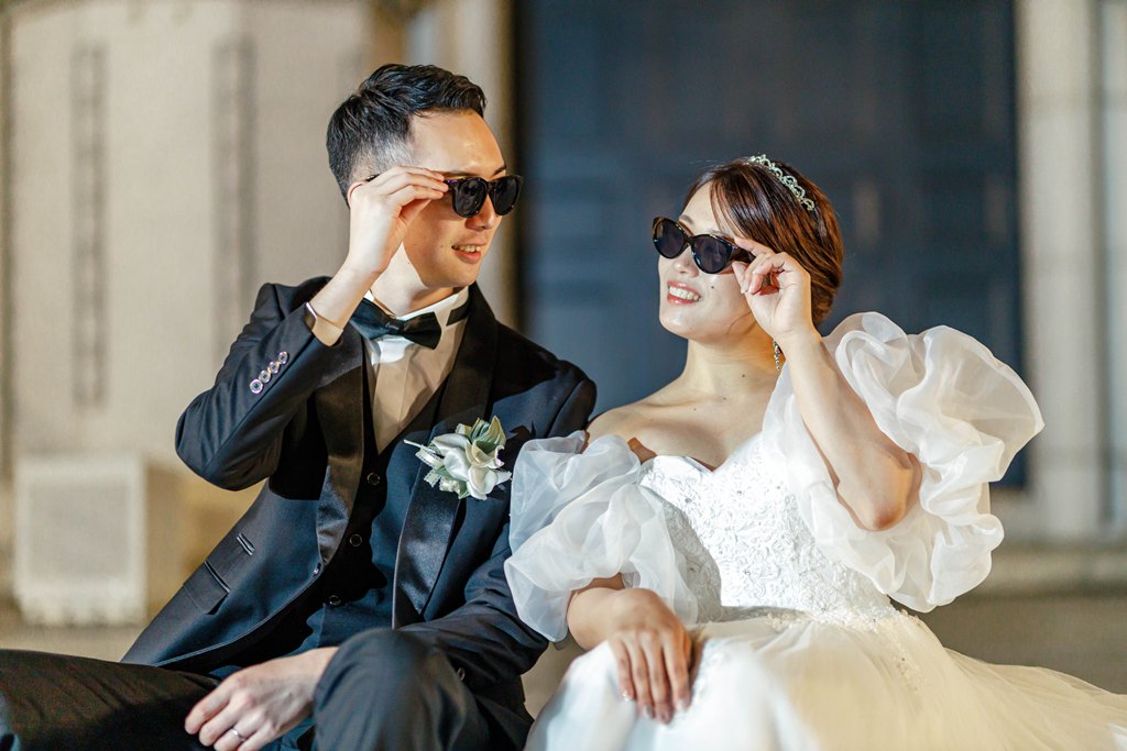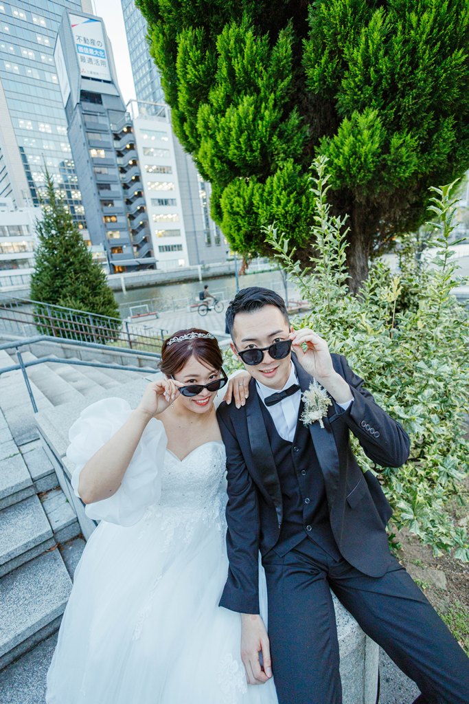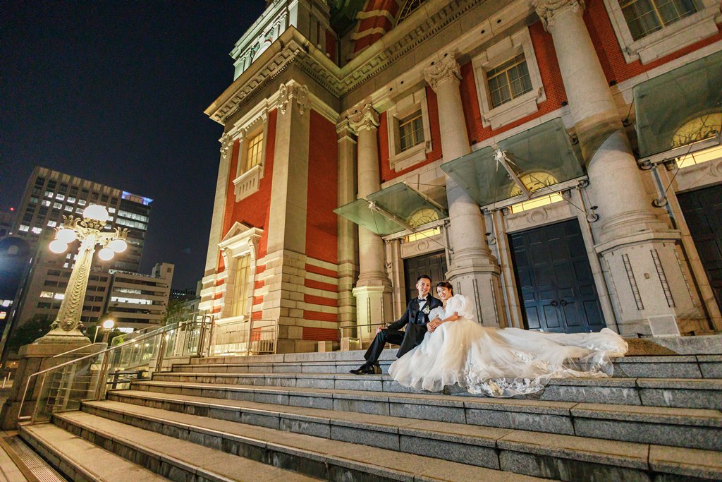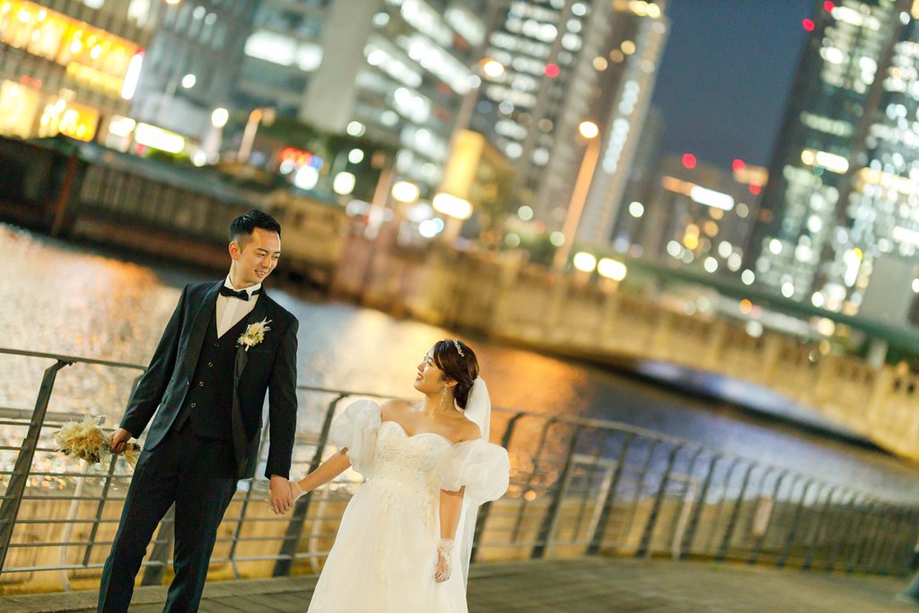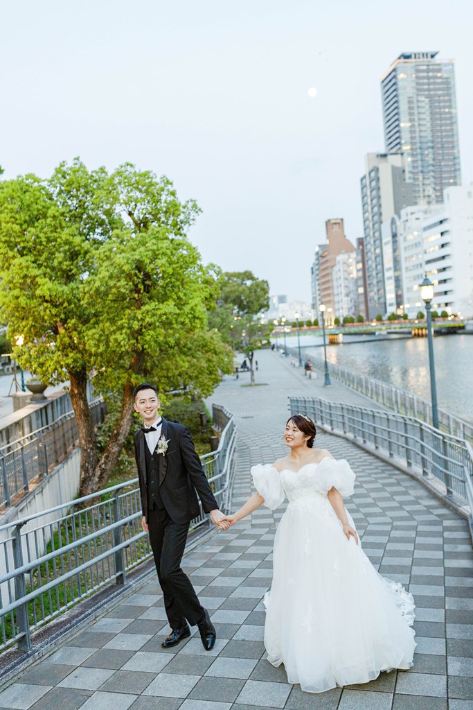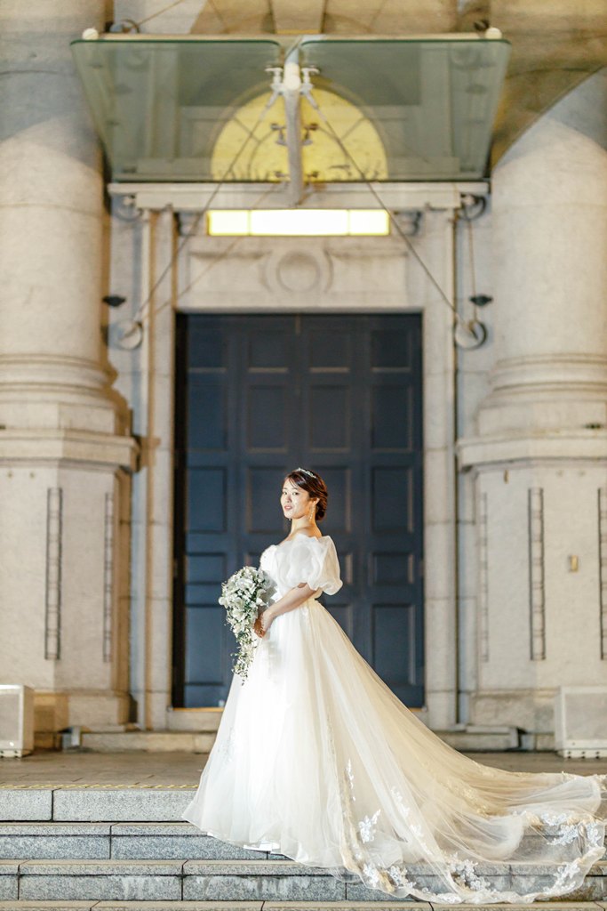 歴史と風格が漂う中央公会堂のライトアップと、ドレス&タキシード姿のおふたりの美しさが見事に重なり合い、まるで映画のワンシーンのような、幻想的でロマンチックな時間となりました。