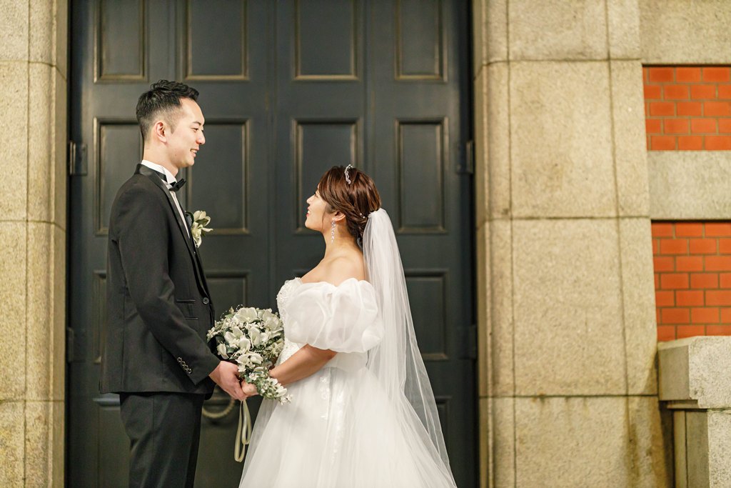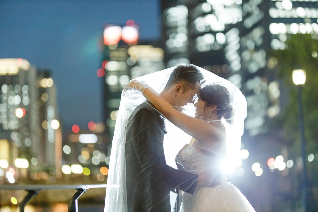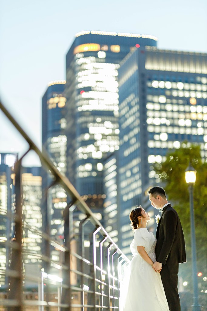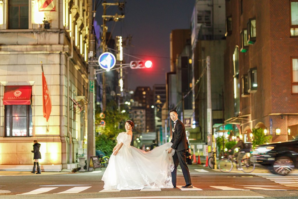 光と影がつくるドラマティックな空間の中で、おふたりが見つめ合い、歩くたびに、空気さえも特別に感じられました。夜の撮影は緊張や寒さもあったかと思いますが、そんな中でも自然に笑い合うおふたりの姿に、私たちスタッフも何度も胸が熱くなりました。