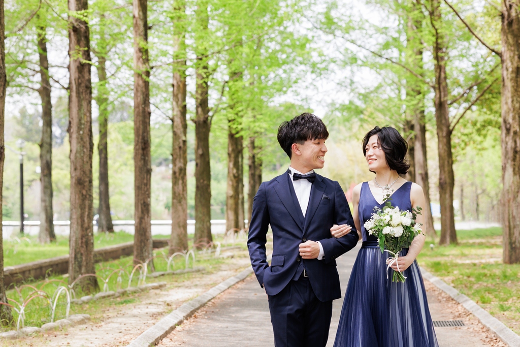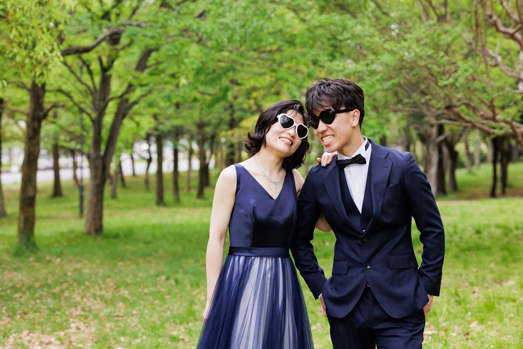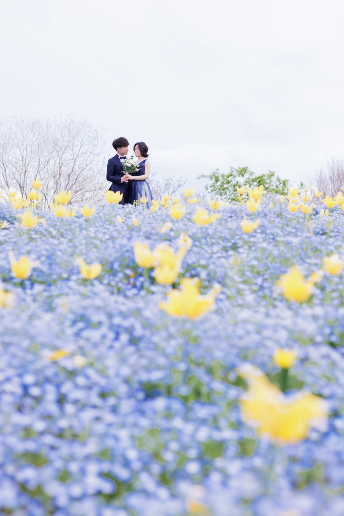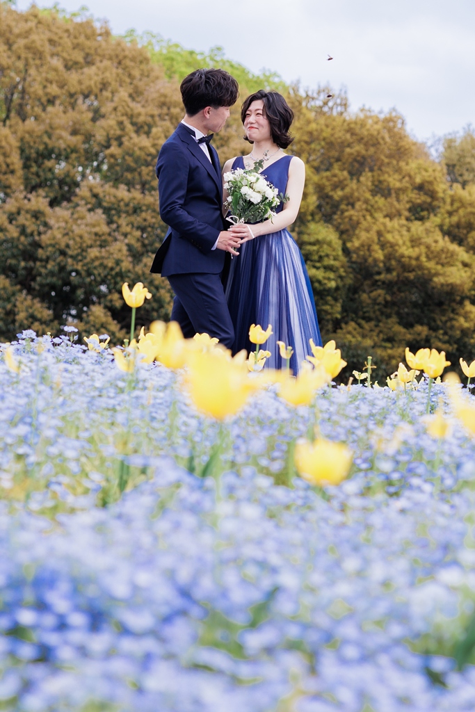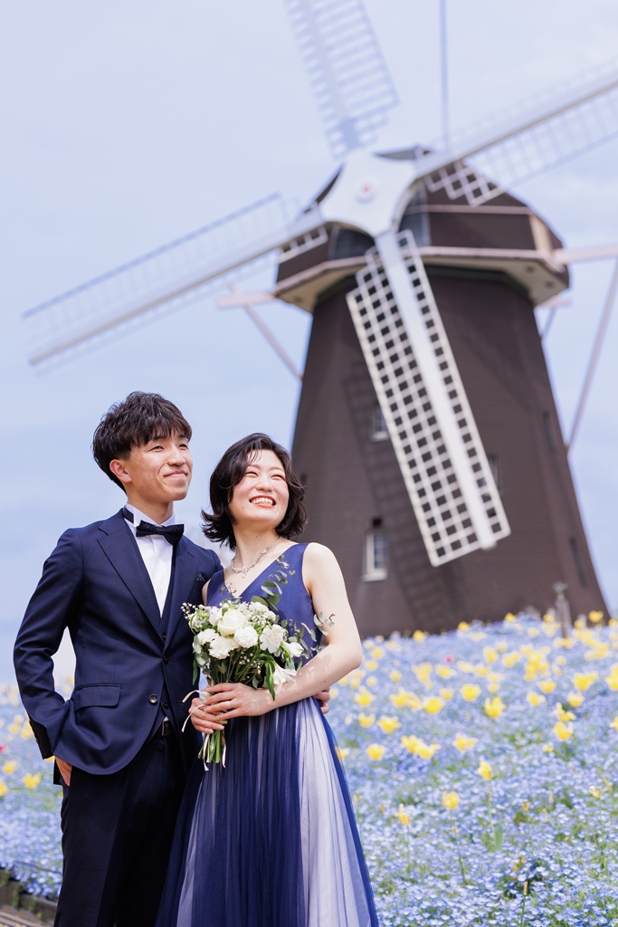 風車がそびえ立ち、季節の花々が咲き誇る鶴見緑地公園。広い空と豊かな緑が広がるこの場所で、ドレスとタキシードに身を包んだおふたりが寄り添う姿は、まるで海外のロマンチック映画のワンシーンのようでした。チューリップ畑の鮮やかな色彩や、大きな池に映るシルエット、木漏れ日にきらめくドレスの裾――そのすべてが調和し、一瞬一瞬が「ふたりだけの物語」としてカメラに収められました。