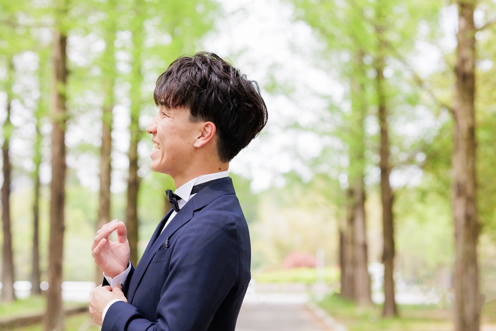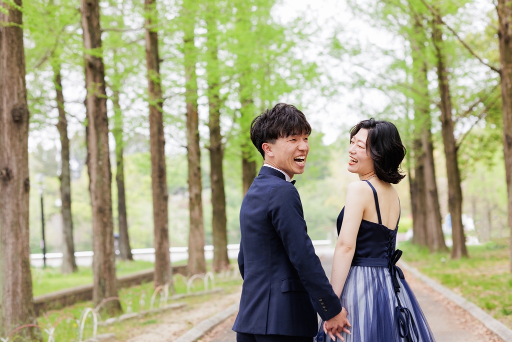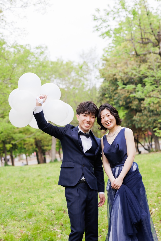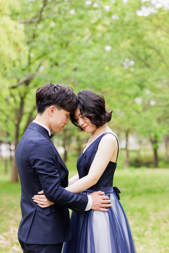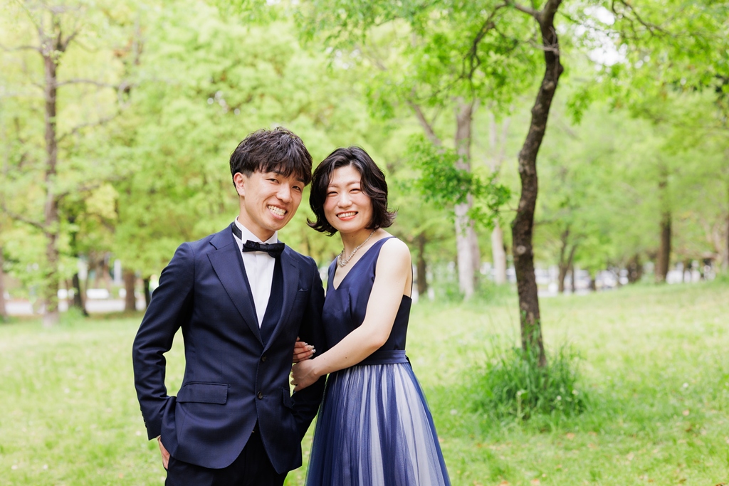 風車がそびえ立ち、季節の花々が咲き誇る鶴見緑地公園。広い空と豊かな緑が広がるこの場所で、ドレスとタキシードに身を包んだおふたりが寄り添う姿は、まるで海外のロマンチック映画のワンシーンのようでした。チューリップ畑の鮮やかな色彩や、大きな池に映るシルエット、木漏れ日にきらめくドレスの裾――そのすべてが調和し、一瞬一瞬が「ふたりだけの物語」としてカメラに収められました。