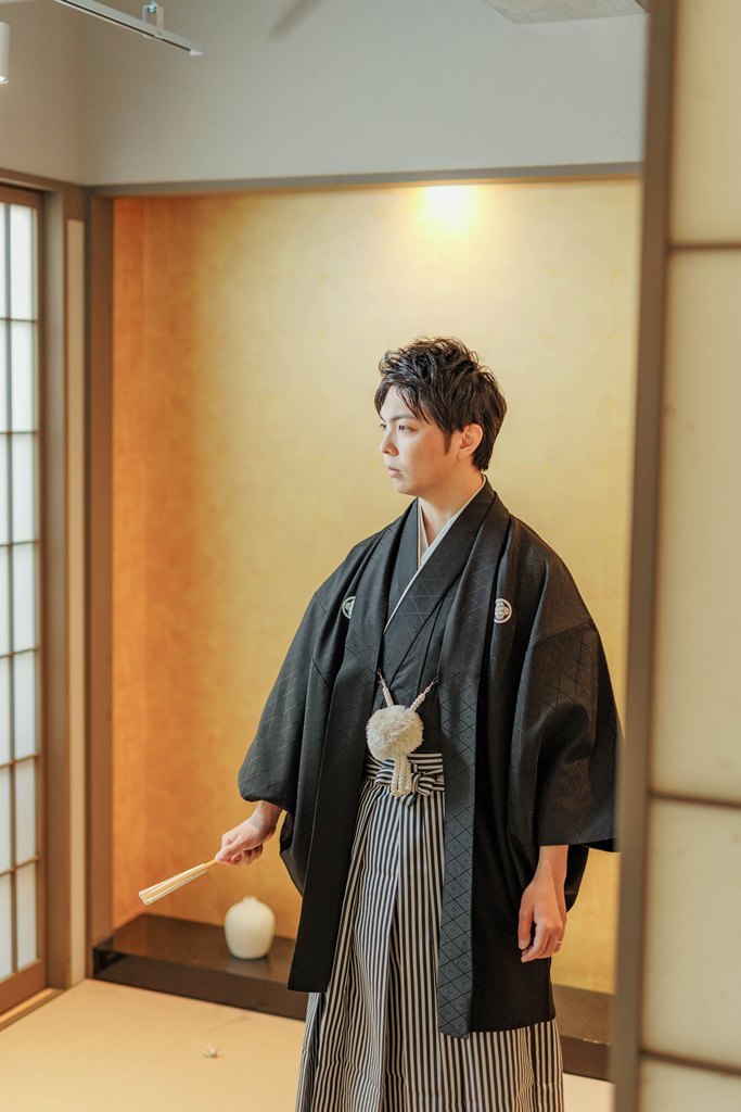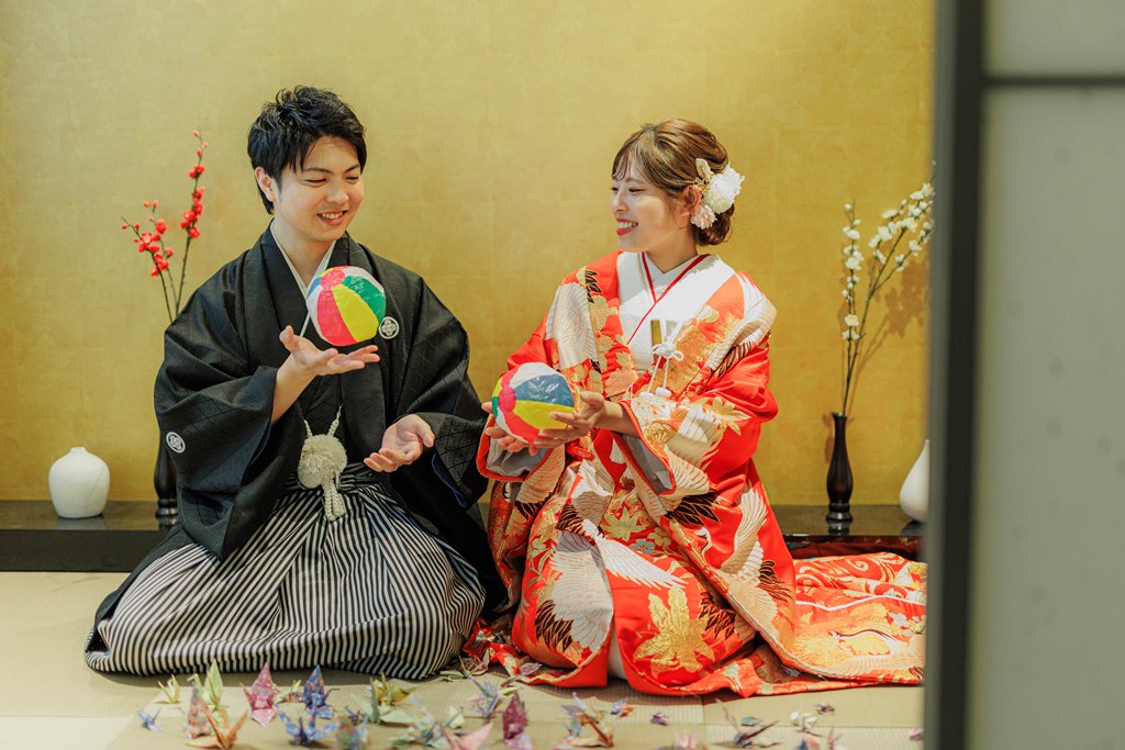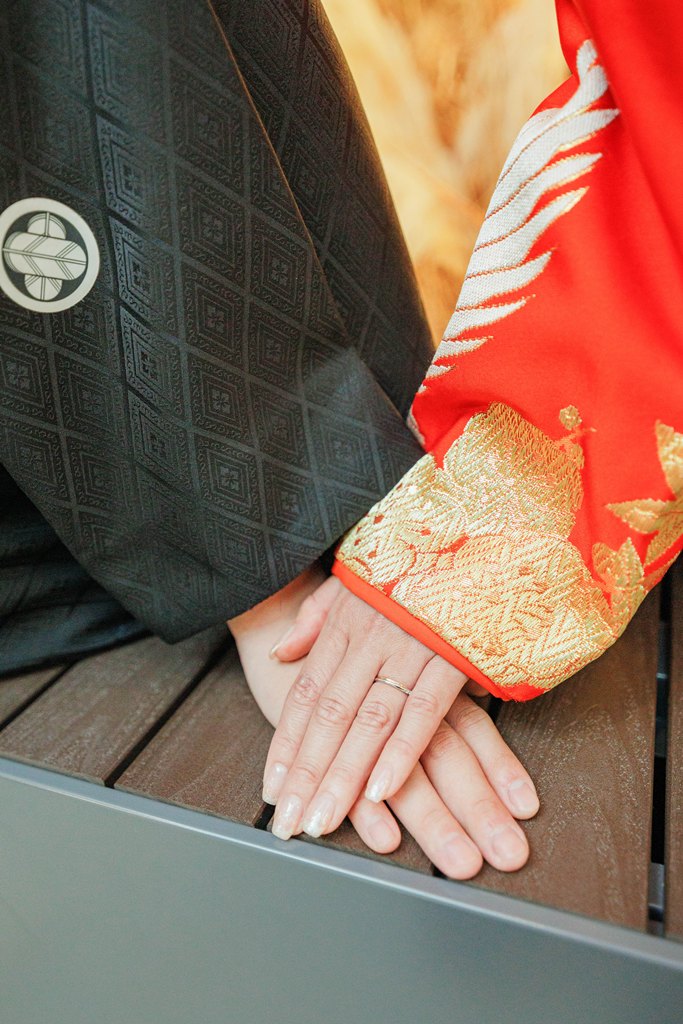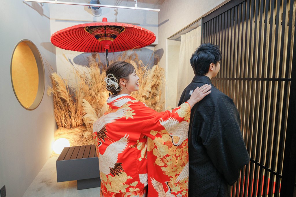 スタジオだからこそ叶う、光と影のコントラスト。シンプルな背景に浮かび上がる、和の優雅さと、おふたりの確かな絆。それは、まさに「本物」の愛をカタチに残す瞬間でした。