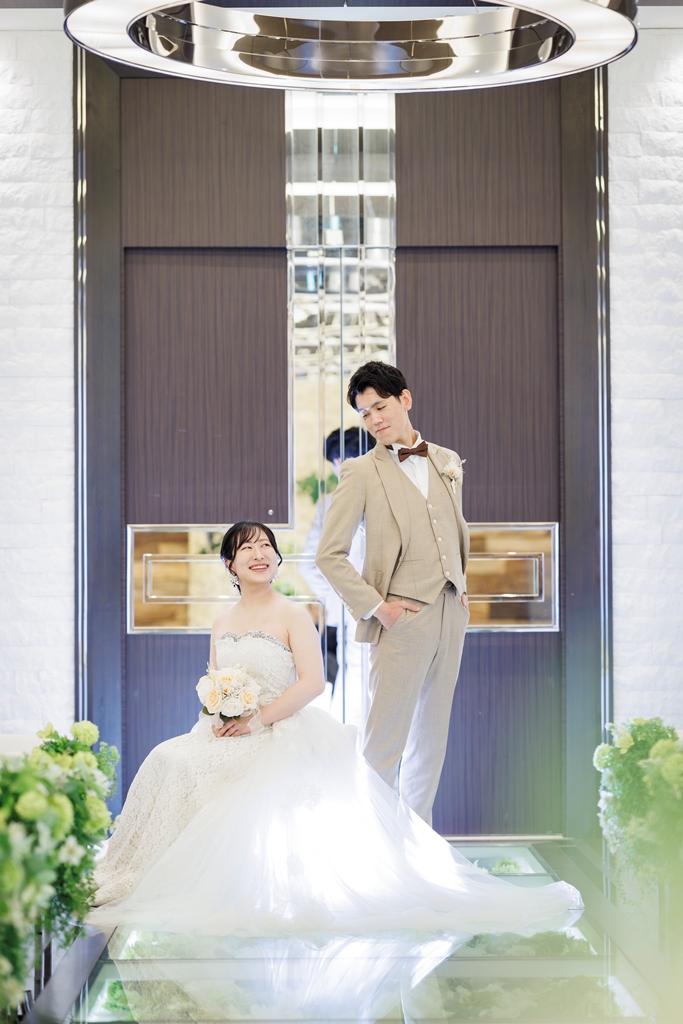 まず、チャペルでの洋装撮影では、まるで海外の映画のワンシーンのような、洗練された空間の中で