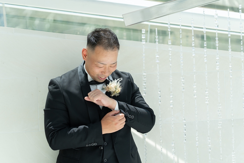 洋装での前撮りは、洗練された気品とクラシカルな華やかさを兼ね備え、チャペルの雰囲気と見事に調和しましたね。純白のドレスが柔らかい光に照らされ、タキシード姿の新郎様と寄り添う瞬間は、まるで永遠を誓う物語のワンシーンのようでした。おふたりのまなざしや笑顔からは、これからの未来への希望や決意が溢れ、撮影に立ち会う私たちも胸が熱くなるほどでした。