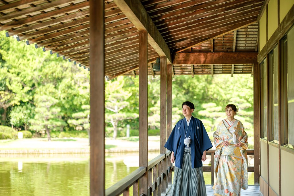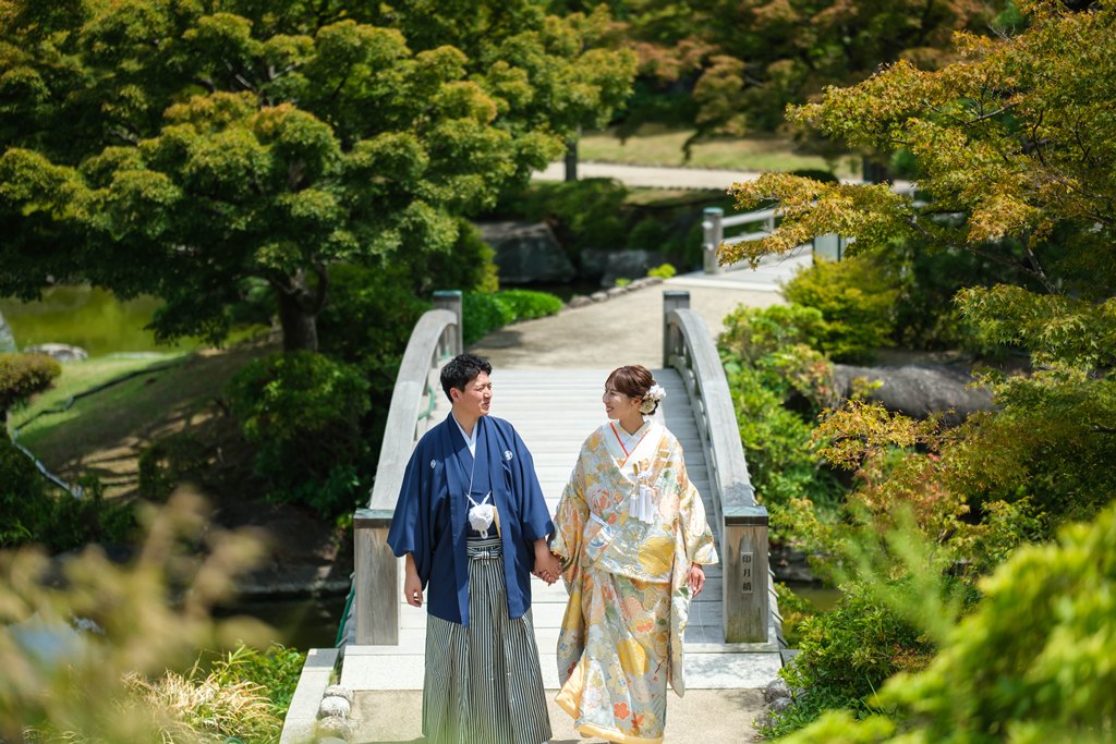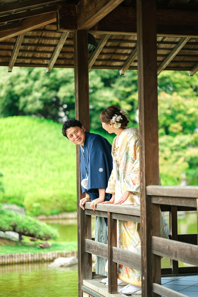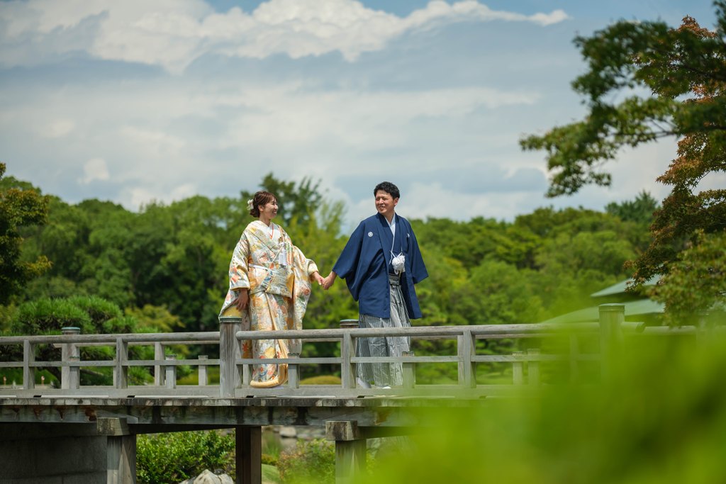 木々の緑に包まれた園内は、和装ならではの気品と奥ゆかしさを引き立て、歩むたびに絵画のような景色が広がります。柔らかな日差しが差し込む小道、池に映るおふたりの姿、そして季節の花々に囲まれた空間は、まるで時が止まったかのような特別な時間を演出してくれました。