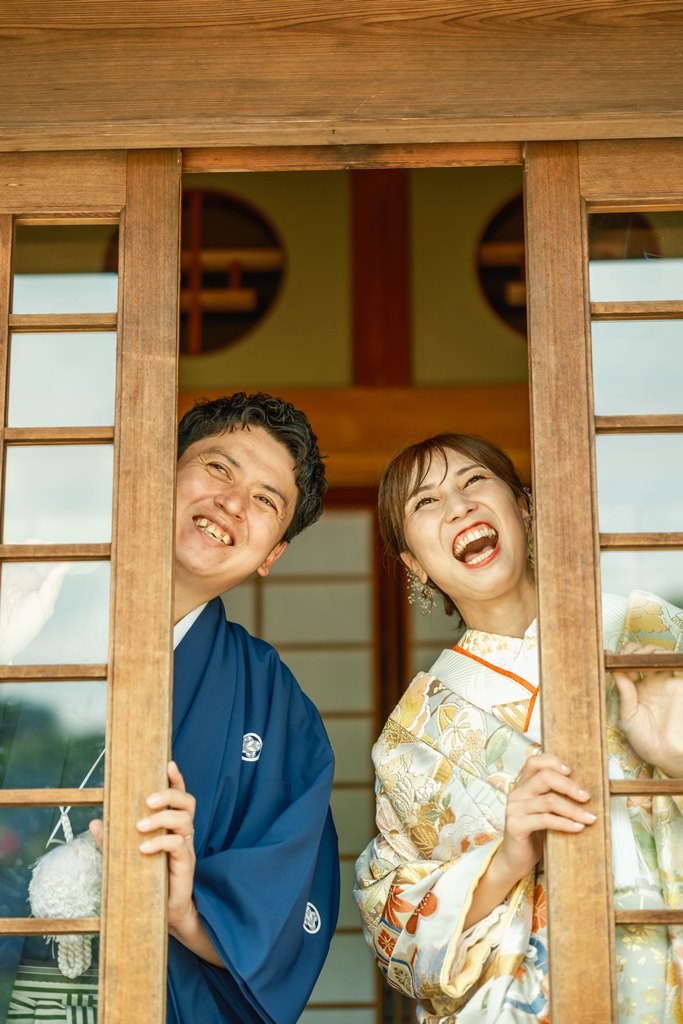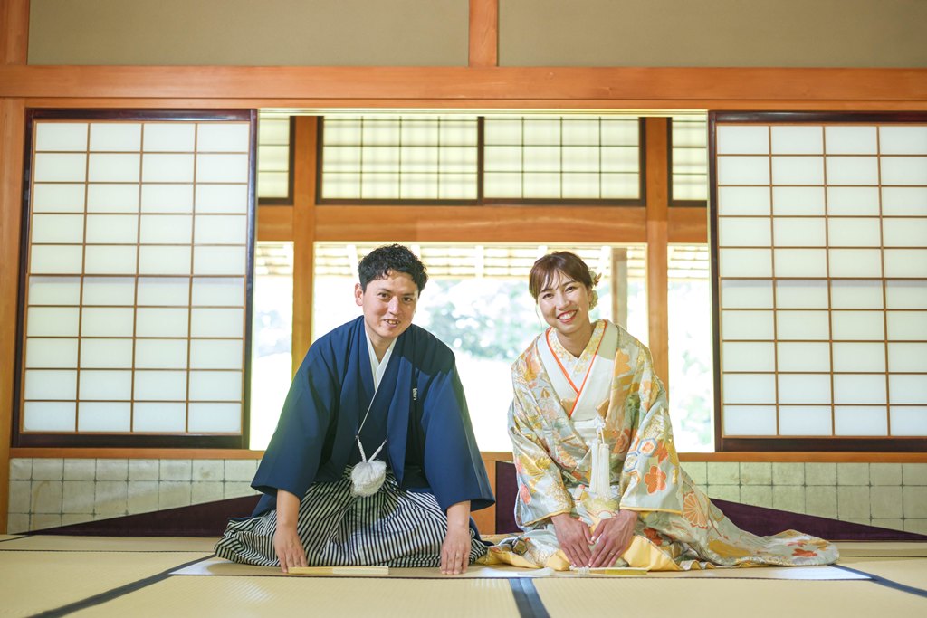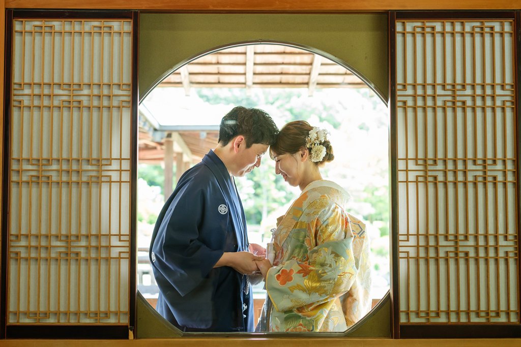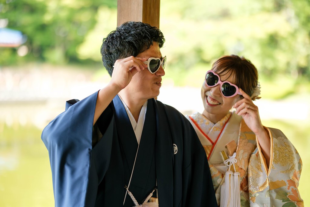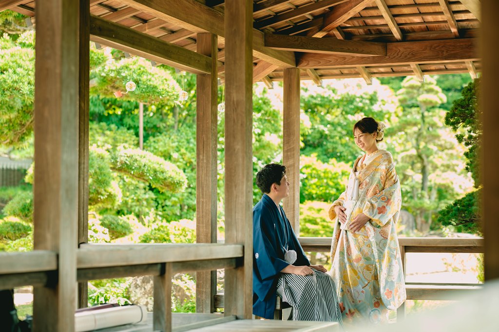 木々の緑に包まれた園内は、和装ならではの気品と奥ゆかしさを引き立て、歩むたびに絵画のような景色が広がります。柔らかな日差しが差し込む小道、池に映るおふたりの姿、そして季節の花々に囲まれた空間は、まるで時が止まったかのような特別な時間を演出してくれました。