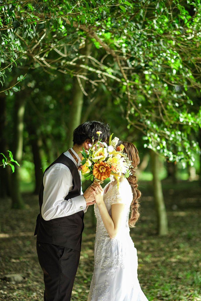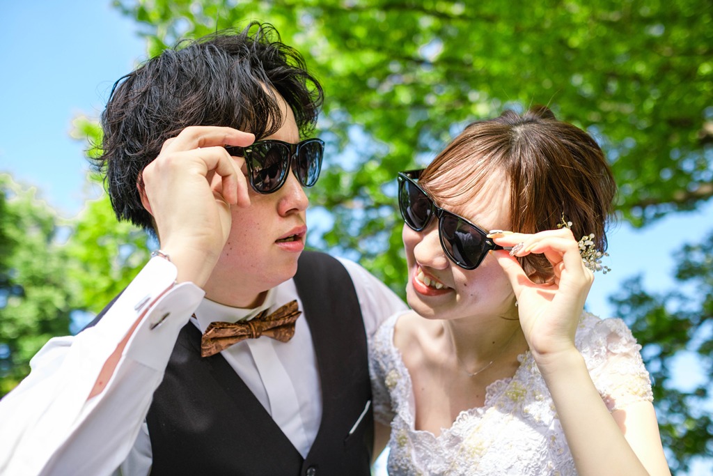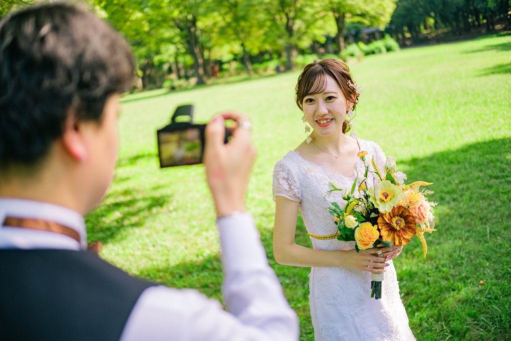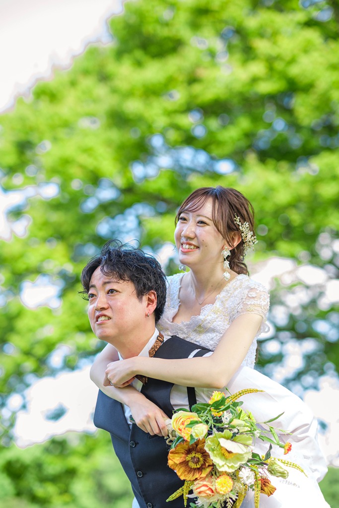 光に包まれた横顔、緑の中で寄り添う姿、ふとした瞬間にこぼれる微笑みの一つひとつが、おふたりらしい魅力で満ちていたのが印象的です。今回の前撮りが、おふたりのこれからの人生において、心に残る大切な記憶として輝き続けますようにと願っております。
