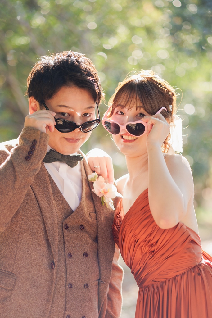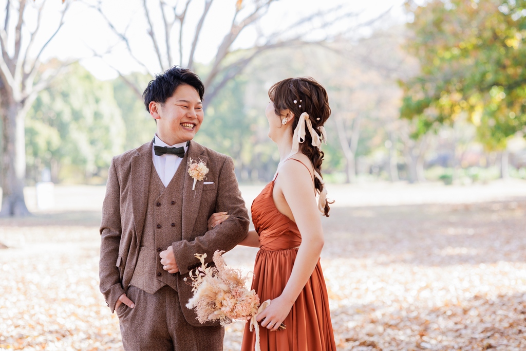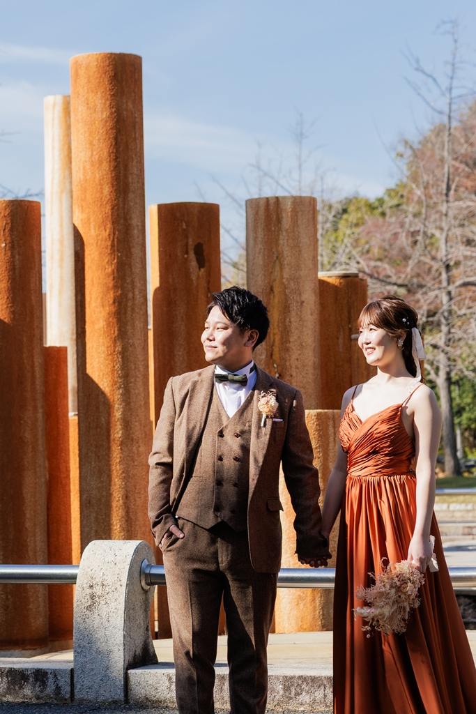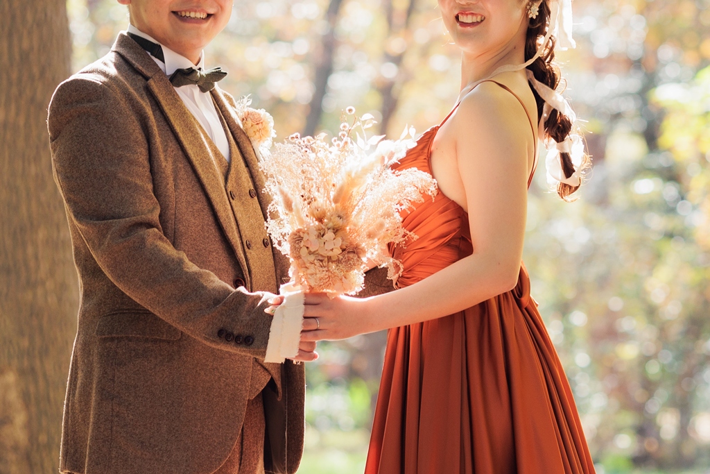秋色を纏う、ブラウンタキシードとテラコッタドレス